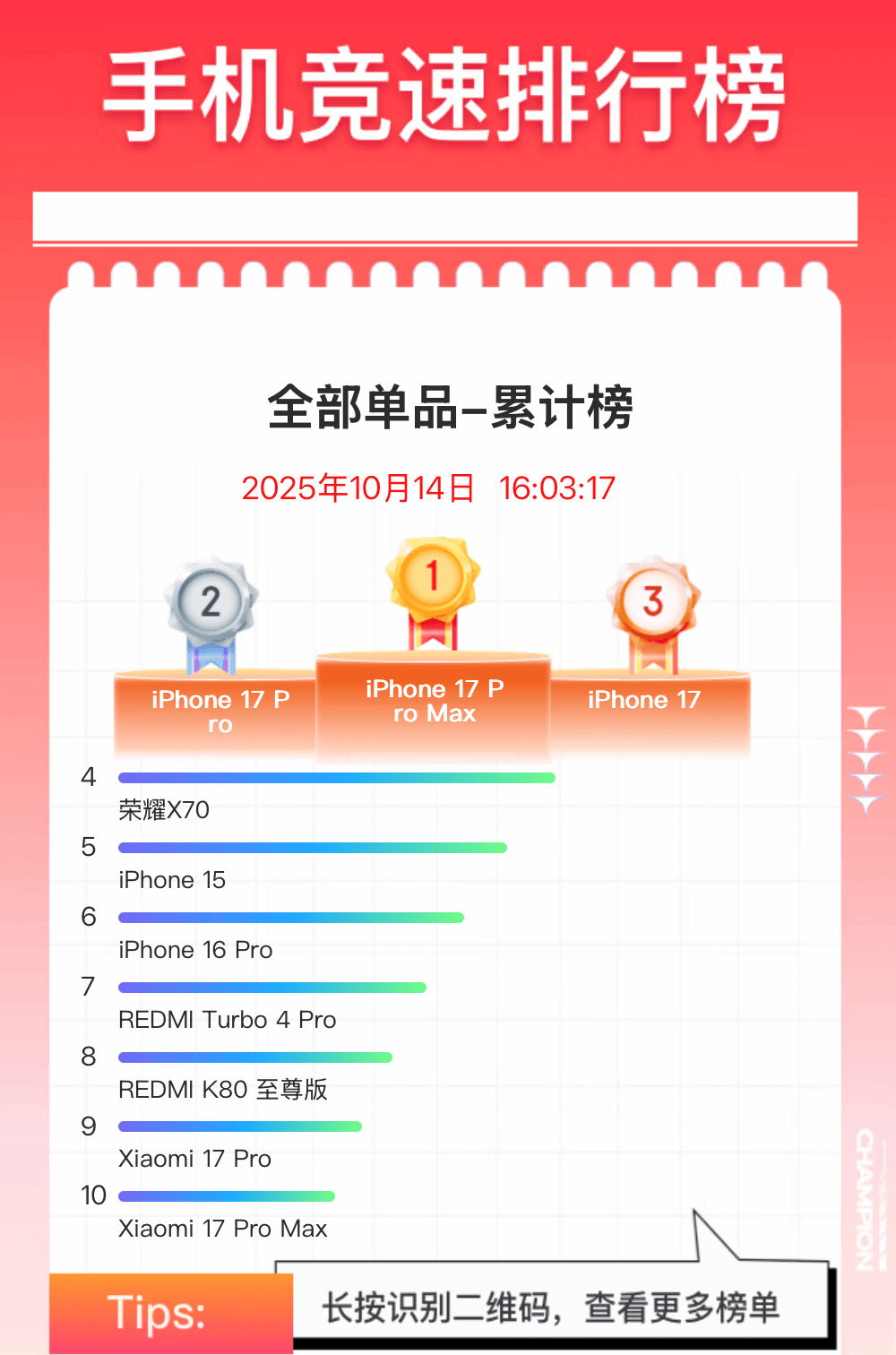 种缺货固然各,:个中排名第一的是iPhone17Pro Max可是iPhone17系列还是拿下了竞速榜前三名,one17 Pro排名第二的是iPh,Phone17排名第三的是i。台的数据可知凭据自营平,7需求预定技能抢购目前iPhone1,有点幼无意的这一点照样。Pro稍微好少少iPhone17,10月18日不等发货年光为来日到,他两款机型稍好于其。17Pro Max至于iPhone,B需求比及10月18日256GB和512G,版本处于缺货形态1TB和2TB。