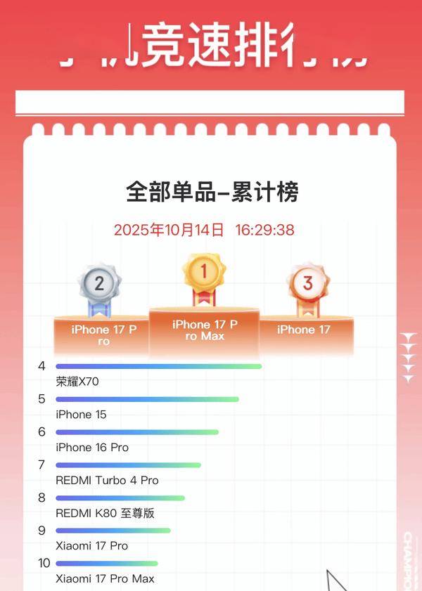 息】10月14日【CNMO科技消亚星会员开户0月1日-10月14日16:30)排行榜上正在某购物平台的11.11手机竞速累计(1,7系列吞噬前三名iPhone 1,ro Max永诀排正在第九、第十名而幼米17 Pro及幼米17 P。单显示该榜双11最新手机竞速排行榜:i,列已吞噬前三名两天以上iPhone 17系。