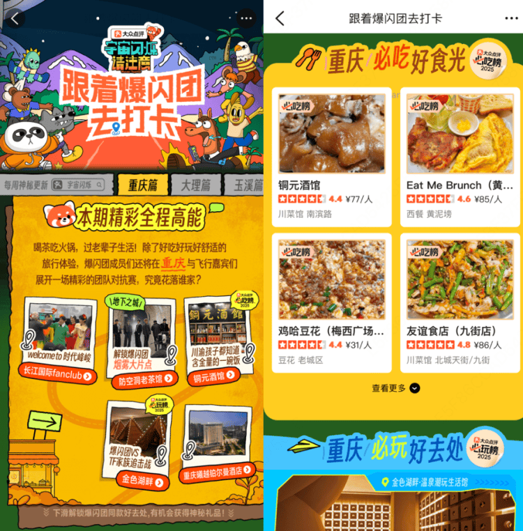 前目,p寻找“宇宙闪耀”用户正在大家点评Ap,款餐厅、打趣地以及影相出片点即可打卡节目中显现的明星同,吃榜”“必玩榜”等吃喝打趣好去向还可一站式浏览重庆当地更多“必;“同款观光消费券”同时供应1000元,闭打卡行为用户投入相,会得回即有机。