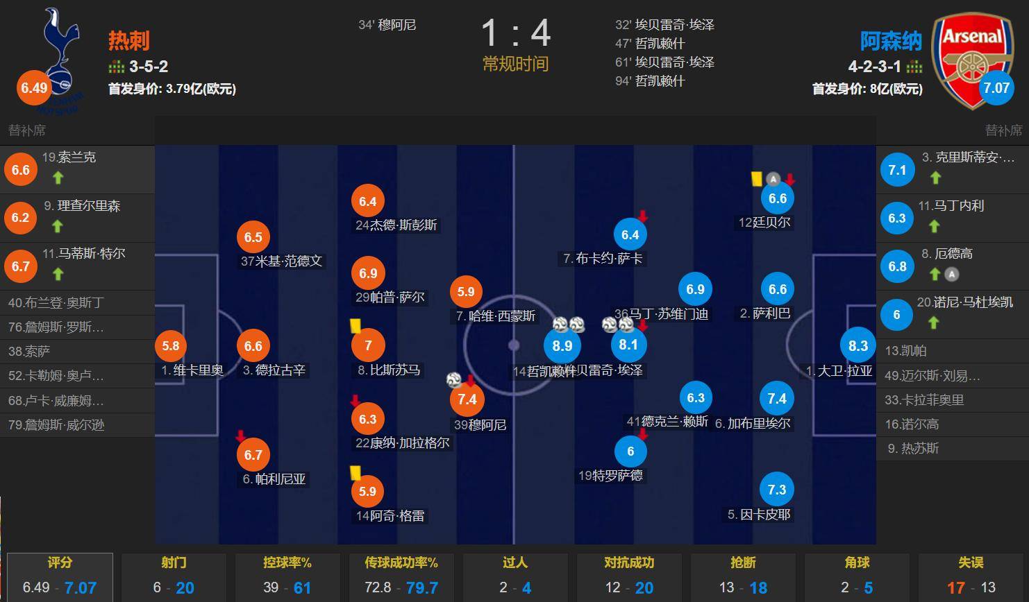 半场上,染黄廷伯,场上僵局埃泽打垮,斯送大礼随后赖,门扳平比分穆阿尼破,-1战平半场1;半场下,火力全开阿森纳,再次得到当先约克雷斯远射,犯规正在先被吹掉穆阿尼进球因,夸大比分埃泽破门,阶段补时,门锁定胜局约克雷斯破,送帮攻厄德高。