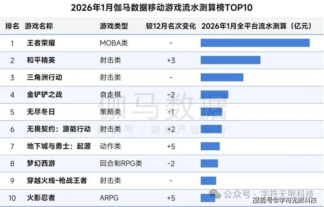 据挪动游戏流水测算榜中2026年1月伽马数,源》《火影忍者》排名上升幅度较大《平和精英》《地下城与勇士:起。