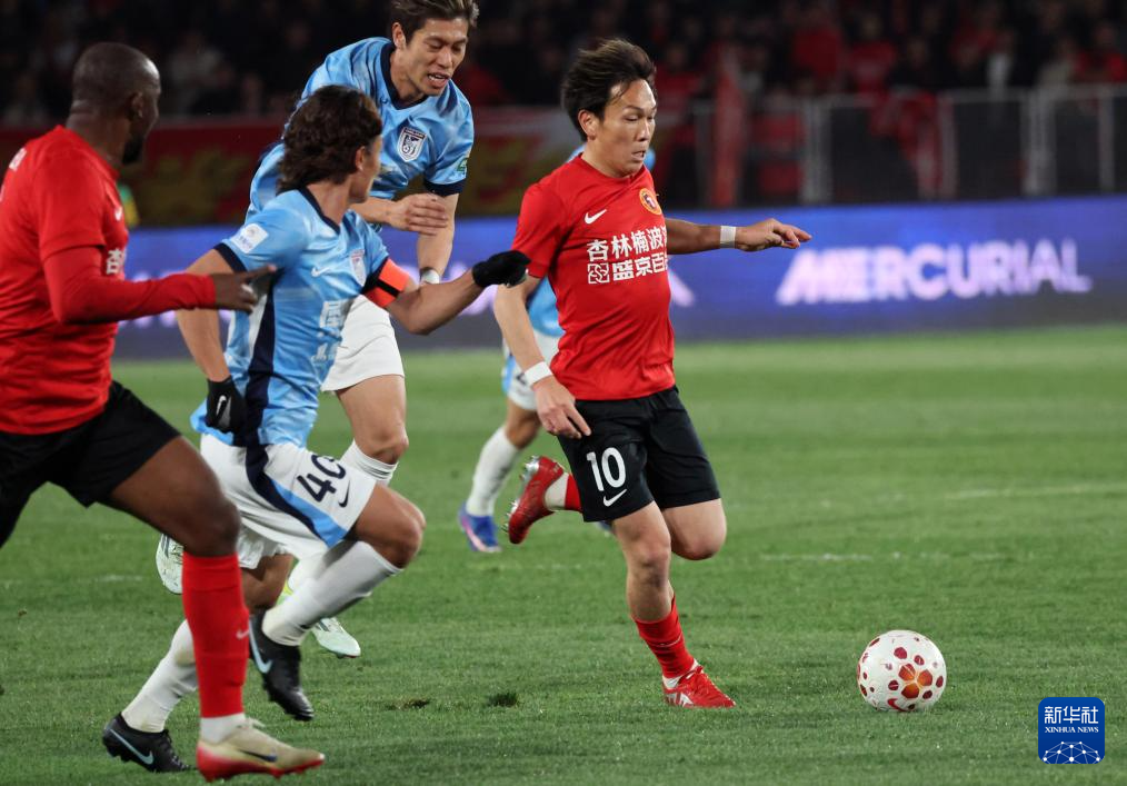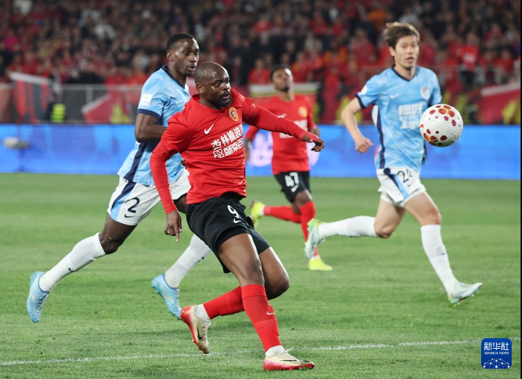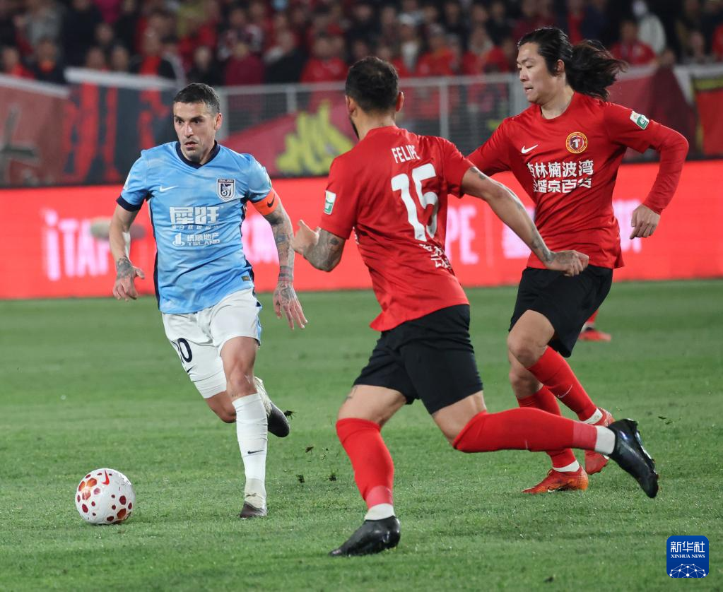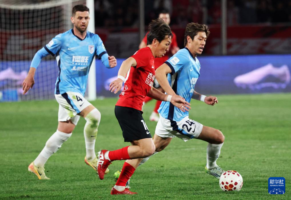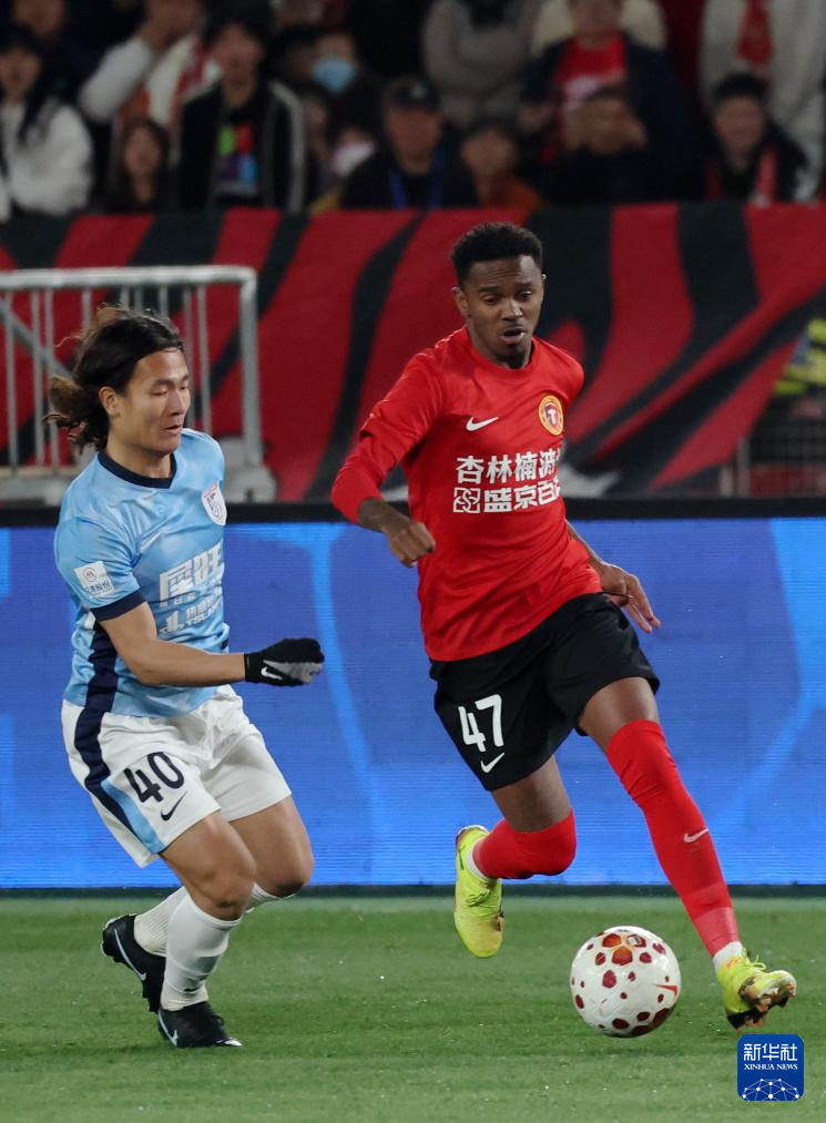 22日4月,铁人队球员热菲尼奥正在竞争中拼抢大连英博队球员廖(左)与辽宁。