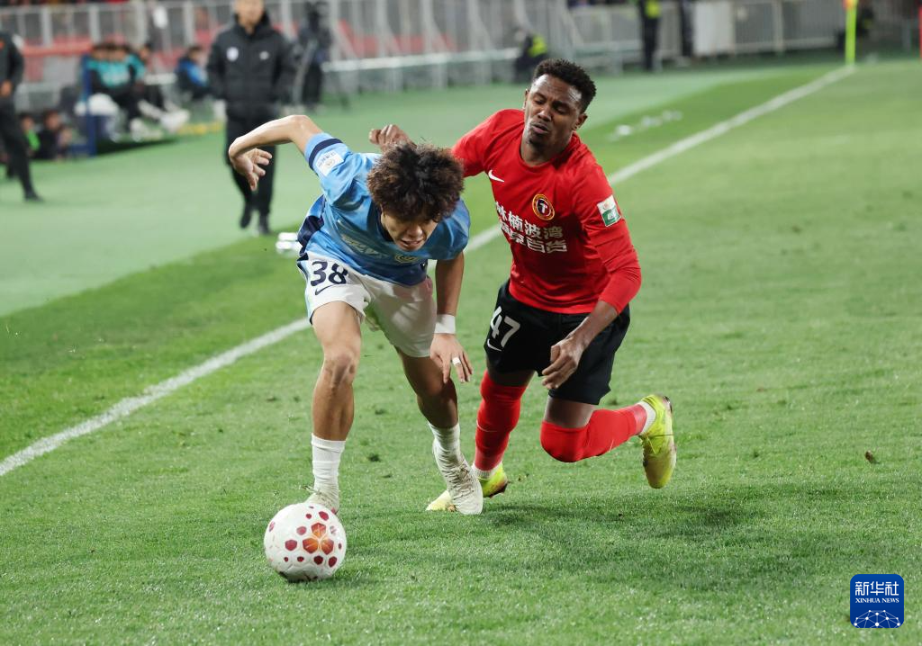 22日4月,宁铁人队球员热菲尼奥正在竞争中拼抢大连英博队球员吕焯毅(左)与辽。